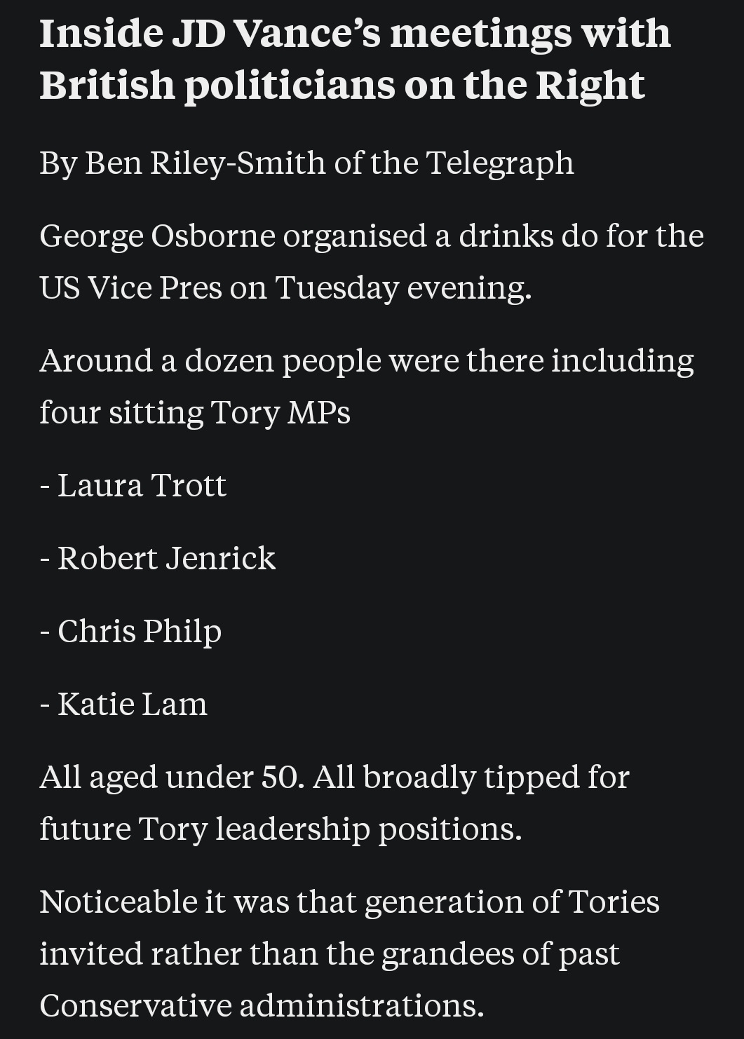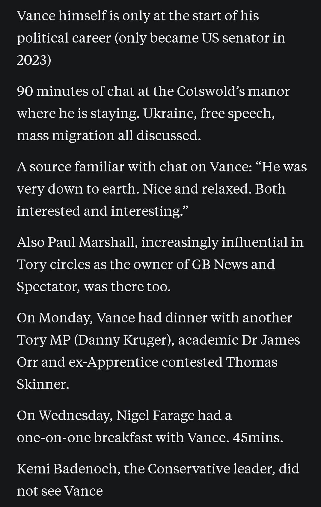 Skinner first came onto my radar in the summer when he was named as one those who JD Vance met while holidaying in the UK. A reminder of Vance’s meetings over the summer.
