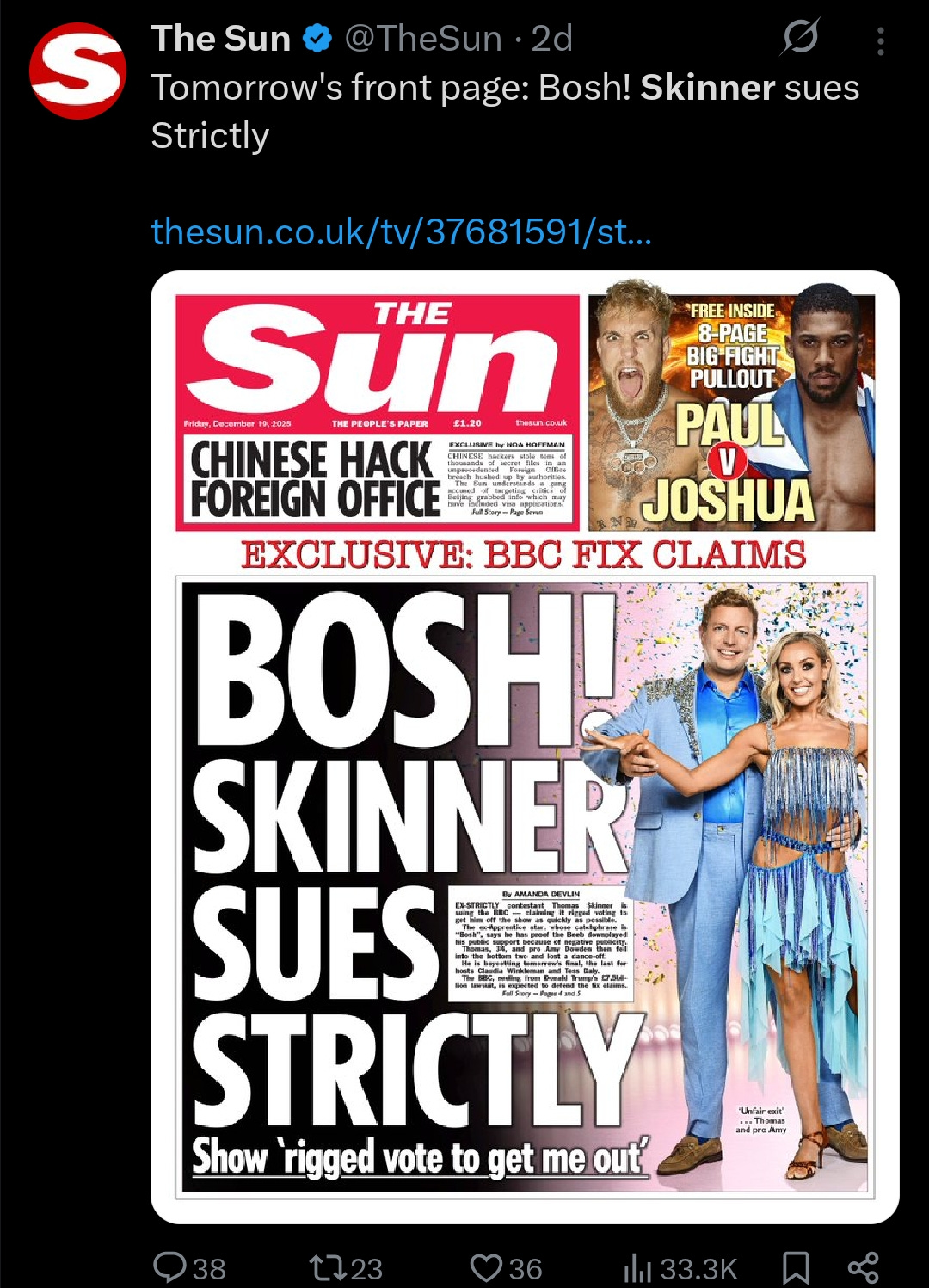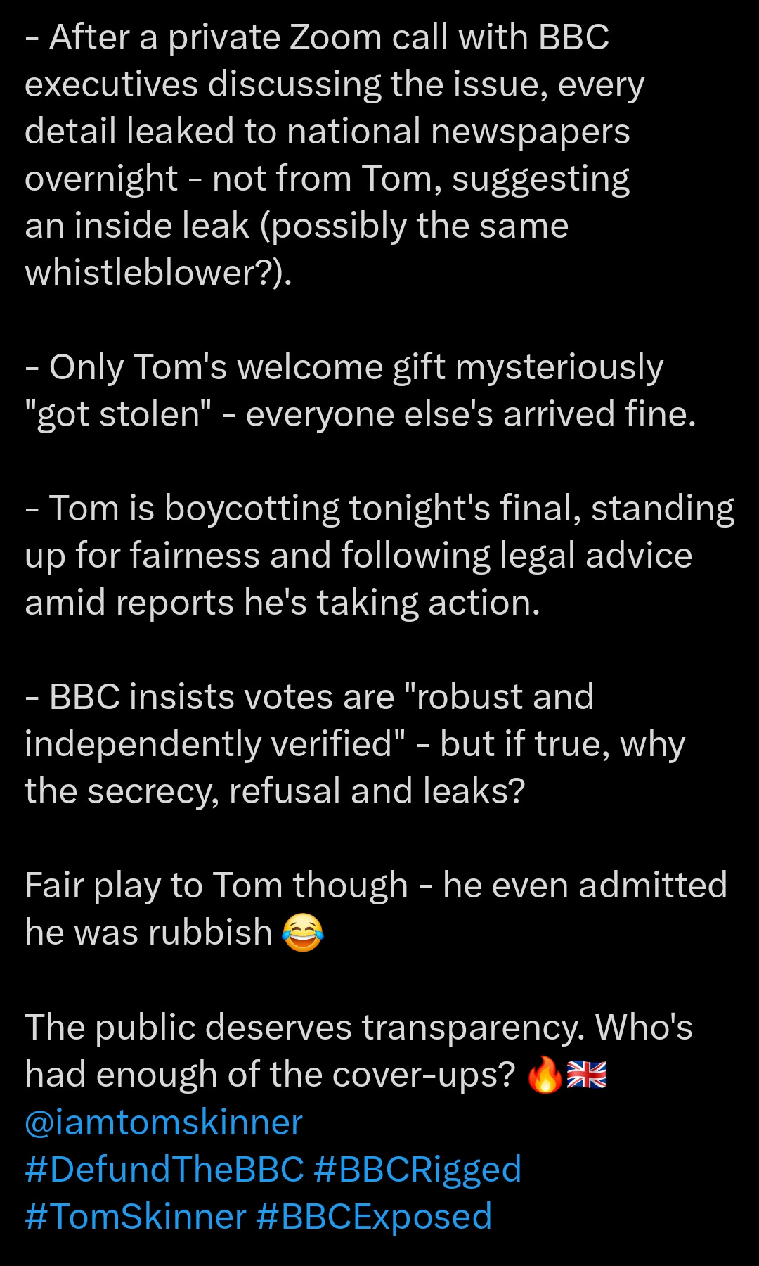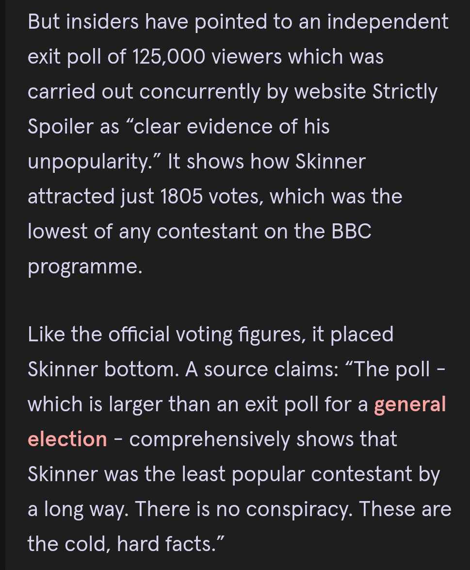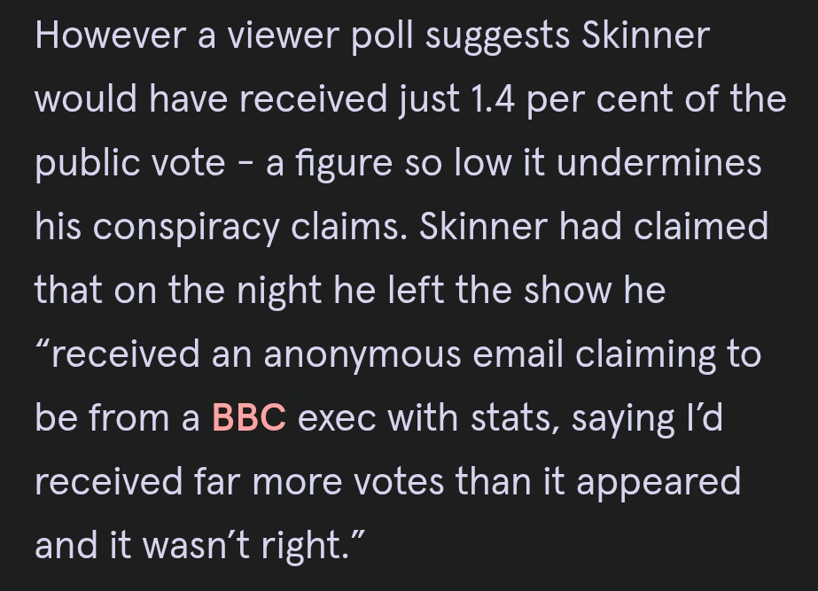 Its unlikely Skinner went on the show with the intention of accusing the BBC of a conspiracy when he lost, more likely he was just hoping to use his appearance as a spring board to gain greater public recognition, but its not a suprised that someone who seems to be in the process of tying themselves to the radical right, ends up portraying themselves as a victim when things don’t go their way.