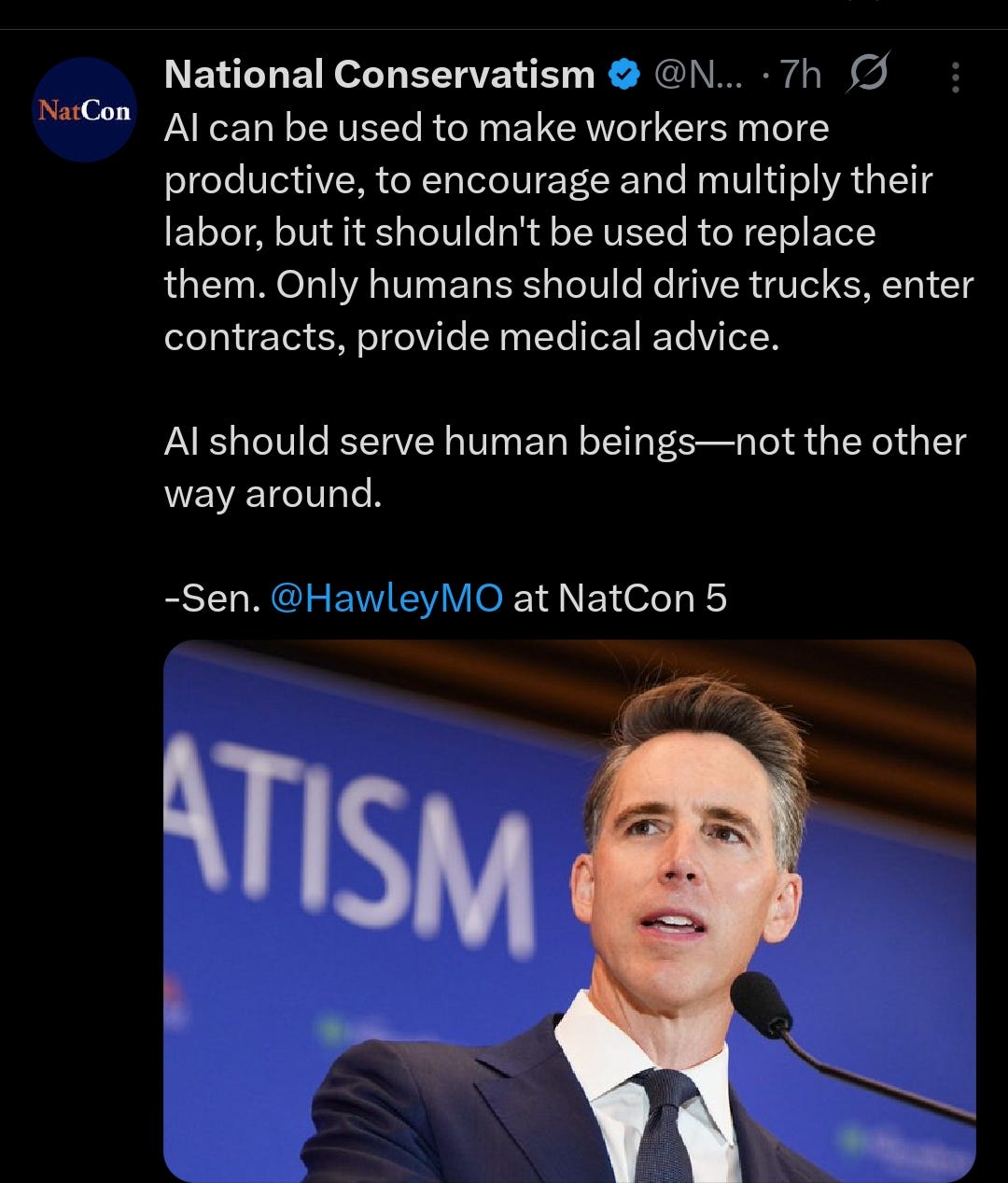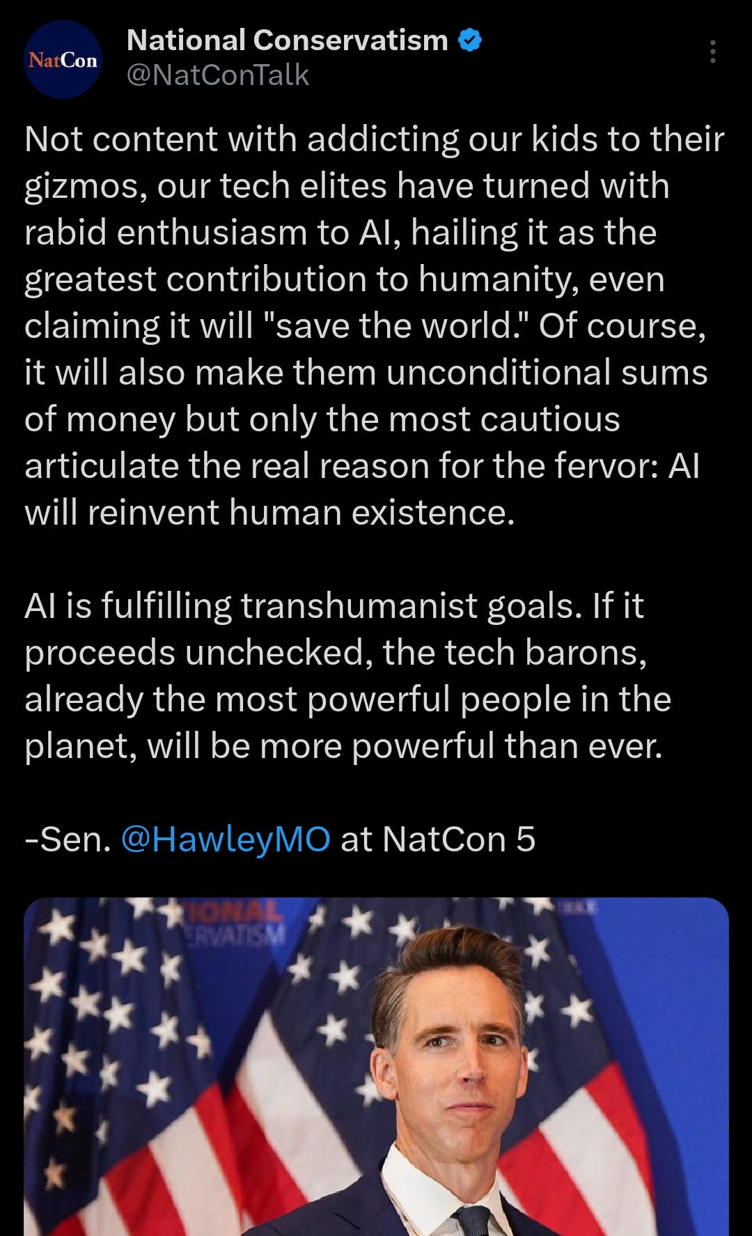 There are sections of the radical right that has wrapped up trans people with transhumanists, but Hawley then goes on to warn about AI.