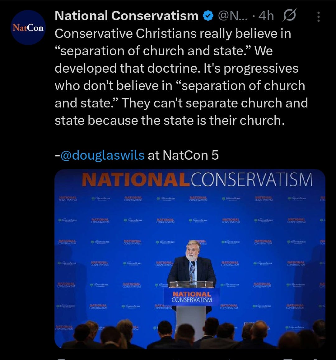 Wilson thinks the state shouldn't interfere in the Church but has been quite open about his thoughts about the power Christianity should have over the state, but pointing this out would ruin his NatCon zinger about progressives worshiping the state.