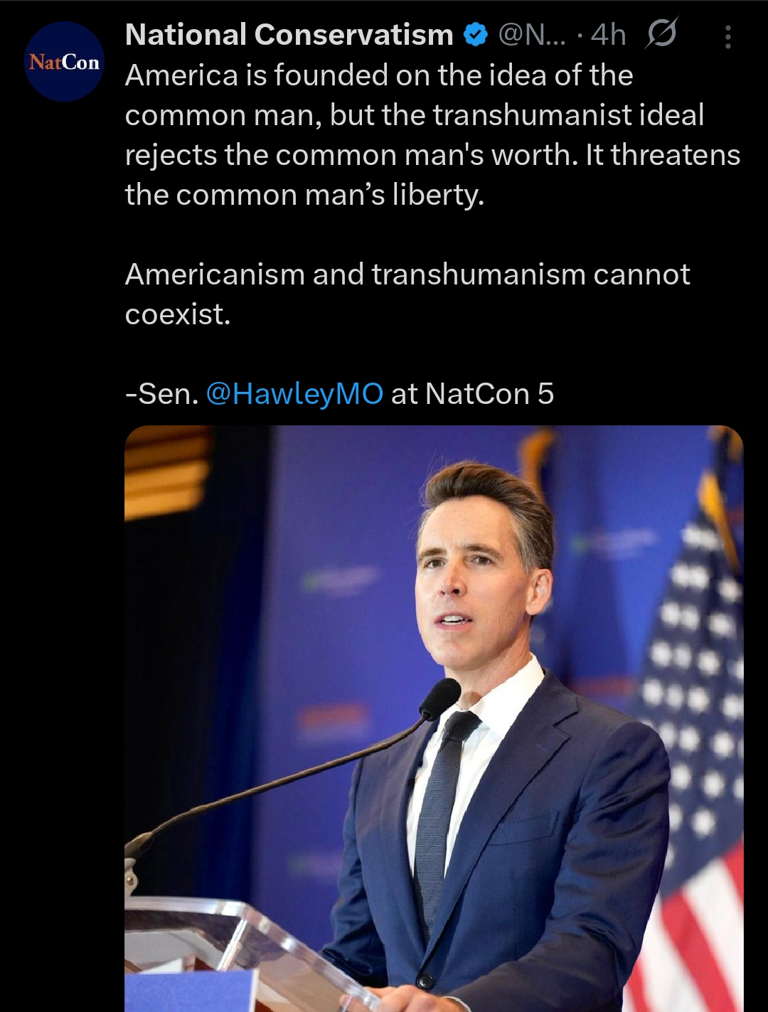 Josh Hawley decided to attack transhumanists. Transhumanists believe in enhancing humans with technology, Musk’s grander claims of the future for Neurolink brain chips could be considered transhumanist, and Peter Thiel, who had a hand in launching NatCon, has various projects and companies exploring extending lifespans in his search for immortality.