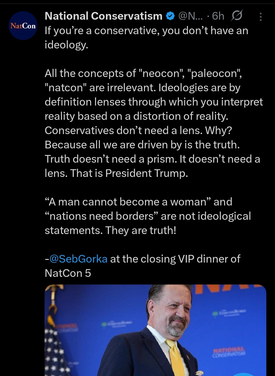 Sebastian Gorka claimed that their is no ideology on the Right, only the truth. Its worth noting that Gorka appears fairly regularly on UK radio and these interviews often end with Gorka shouting over the interviewers and then hanging up when challenged on the truth of his claims.