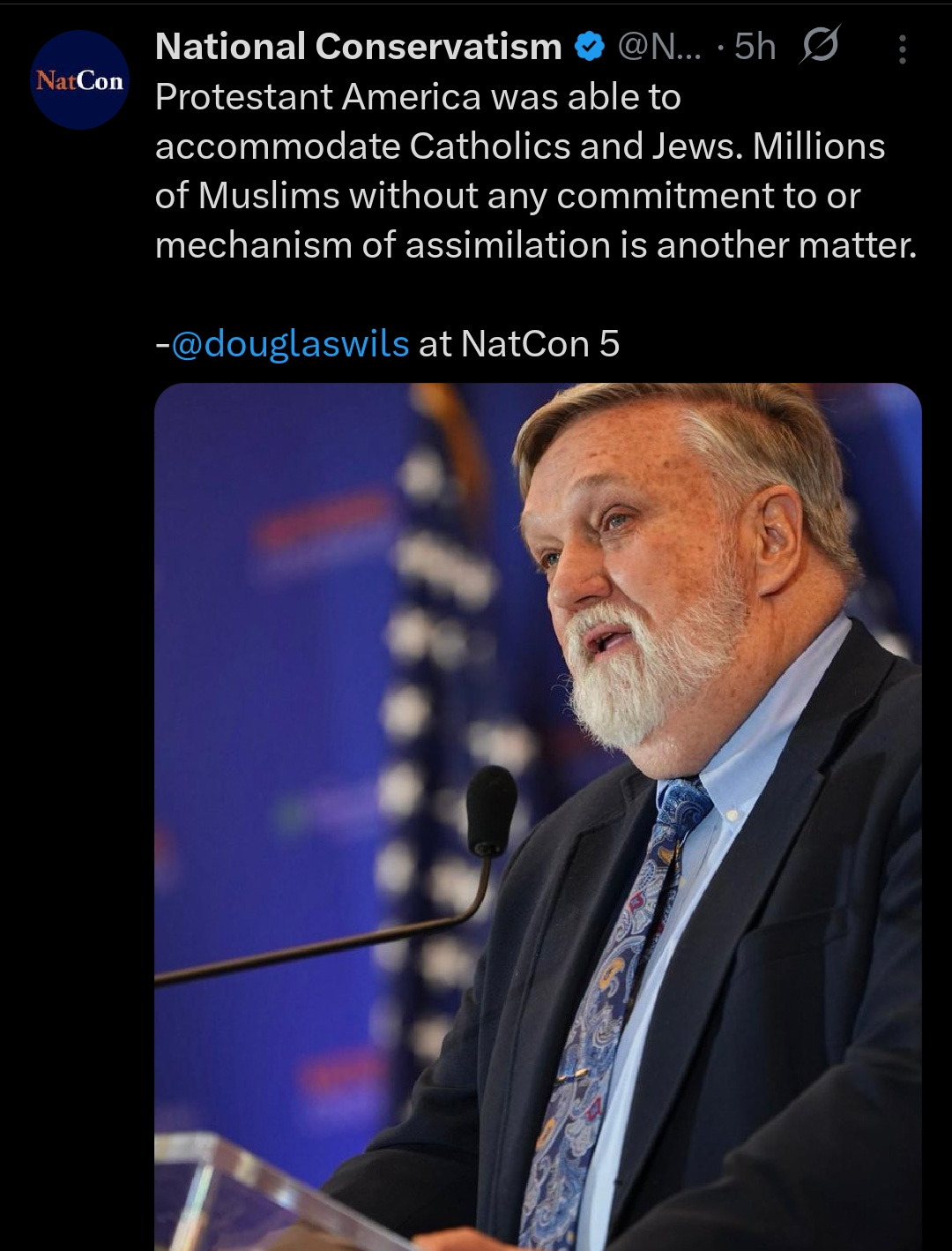 Doug Wilson targets Muslims, however the Christian Nationalist has said that only Christians should be in positions of power. Just Christians, not Jews, however he is being nice for Hazony the NatCon organiser who said on the opening day he was shocked to find antisemitism on the Right wing.