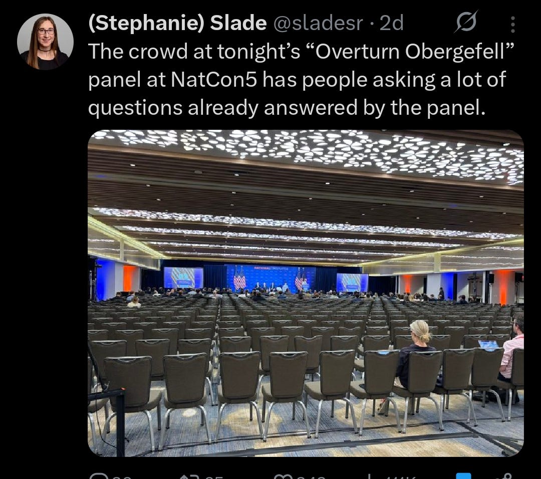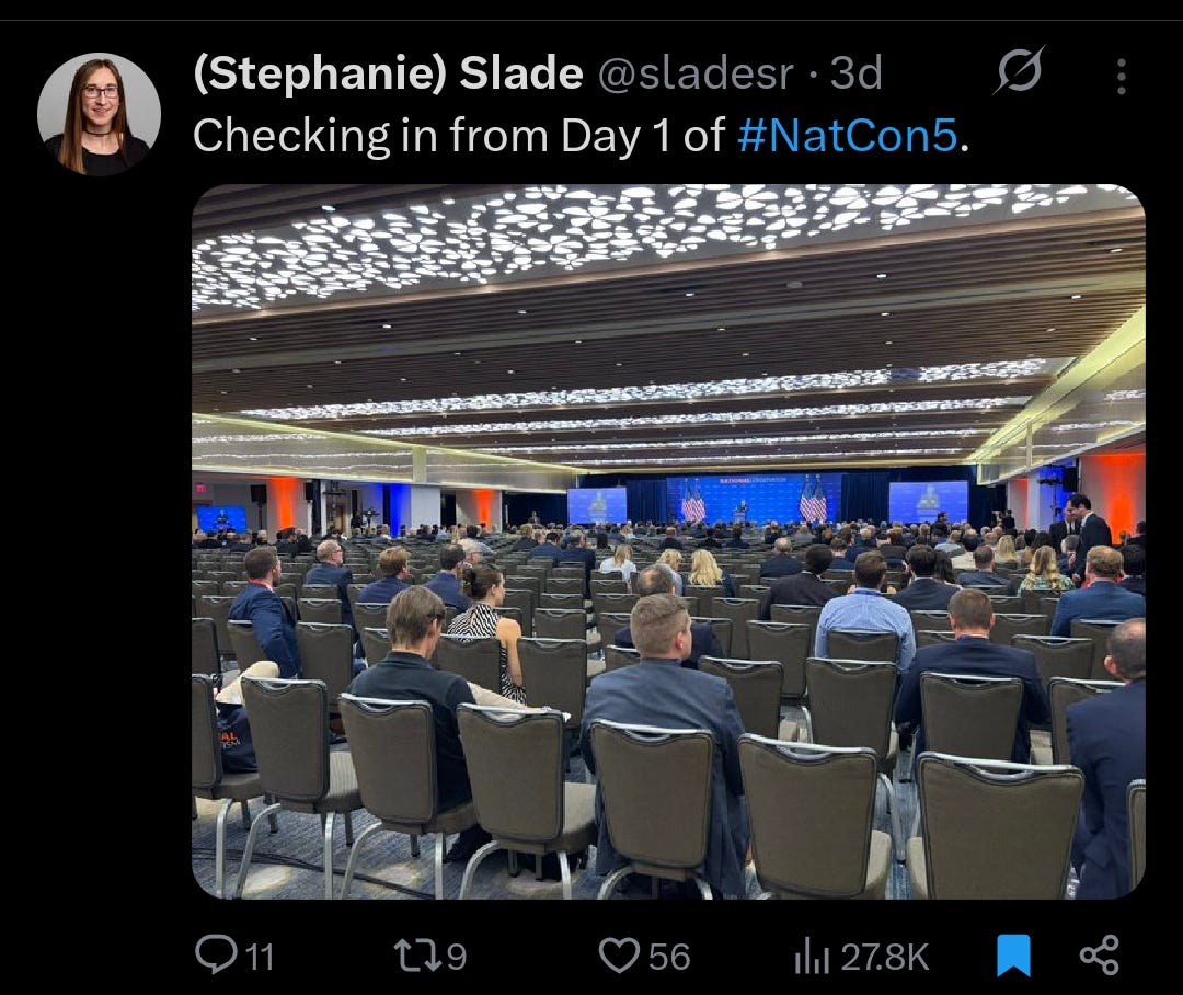 Its worth noting that panning out from the conference stage, NatCon is not a well attended event. It provides material for clips and articles online and brings members of the radical right together to help hold the coalition together.