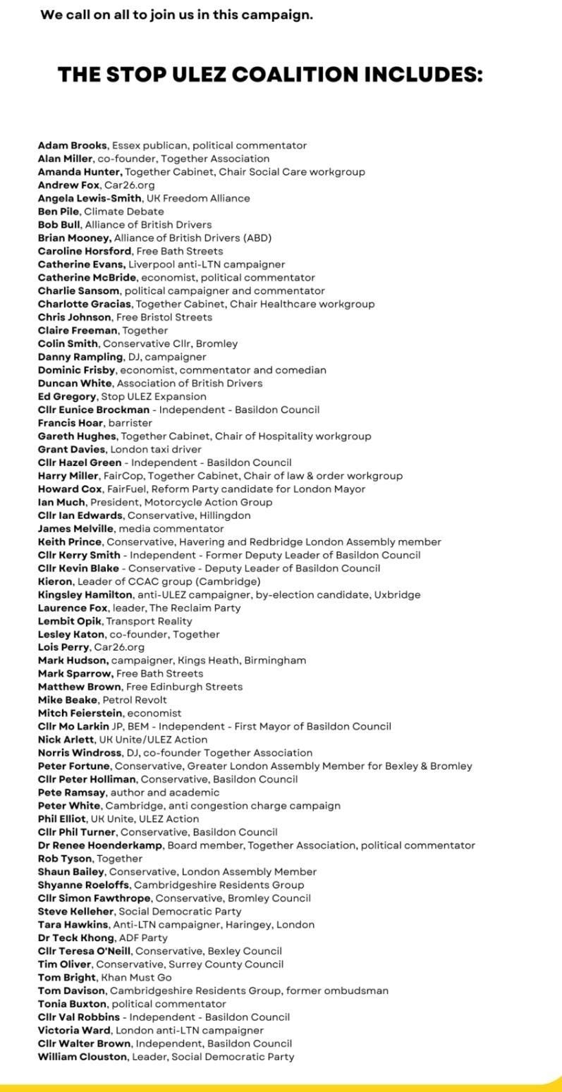 AAUE’s fellow campaigning organisation is the Stop ULEZ Coalition (SUC). SUC’s website also consists of a single page with a declaration, a mailing list sign up and a list of 70 members of the coalition. A considerable number of these names either hold positions in the Together Declaration or have campaigned alongside them on issues relating to COVID, such as GB News regulars James Melville and Tonia Buxton.